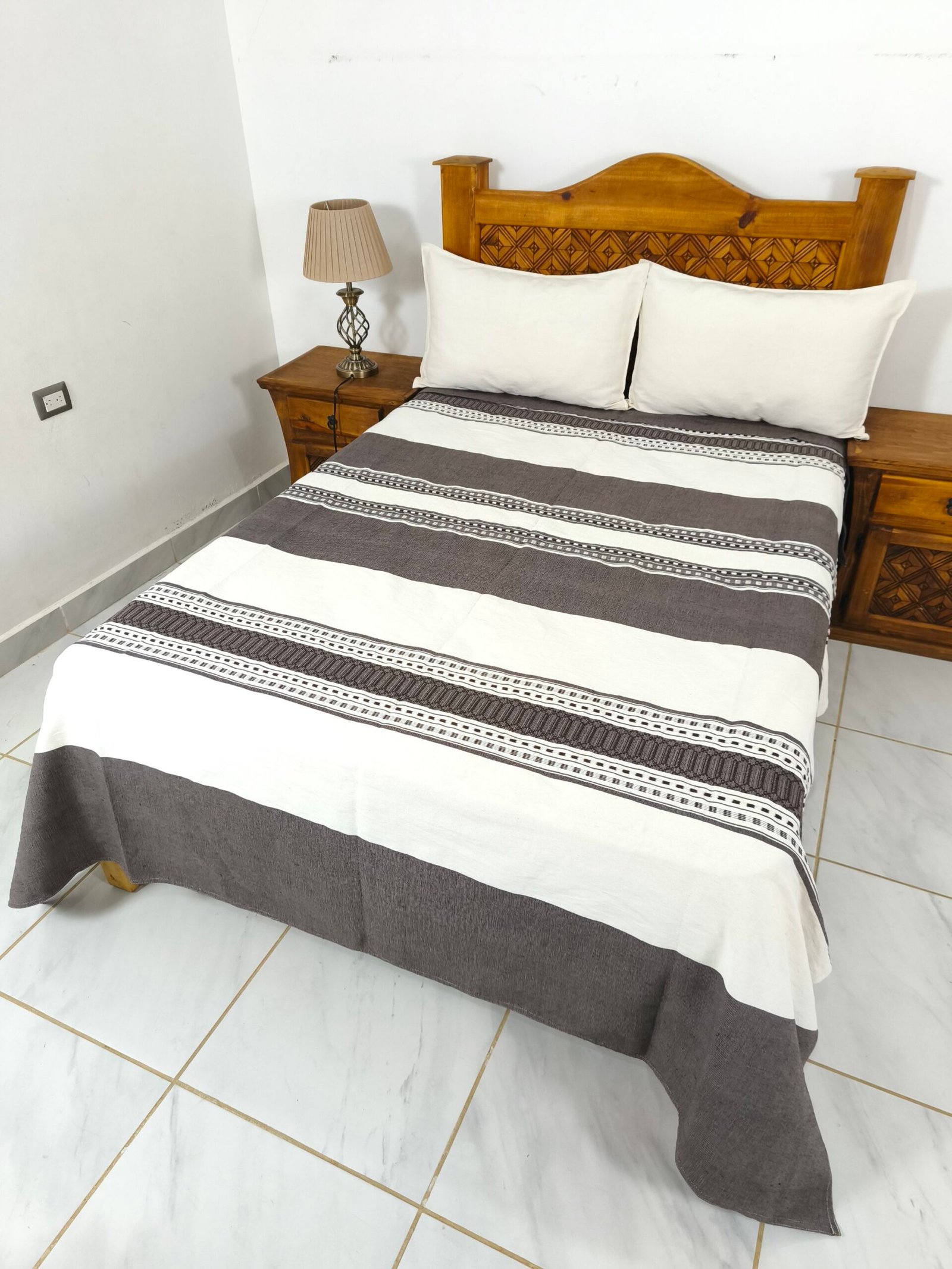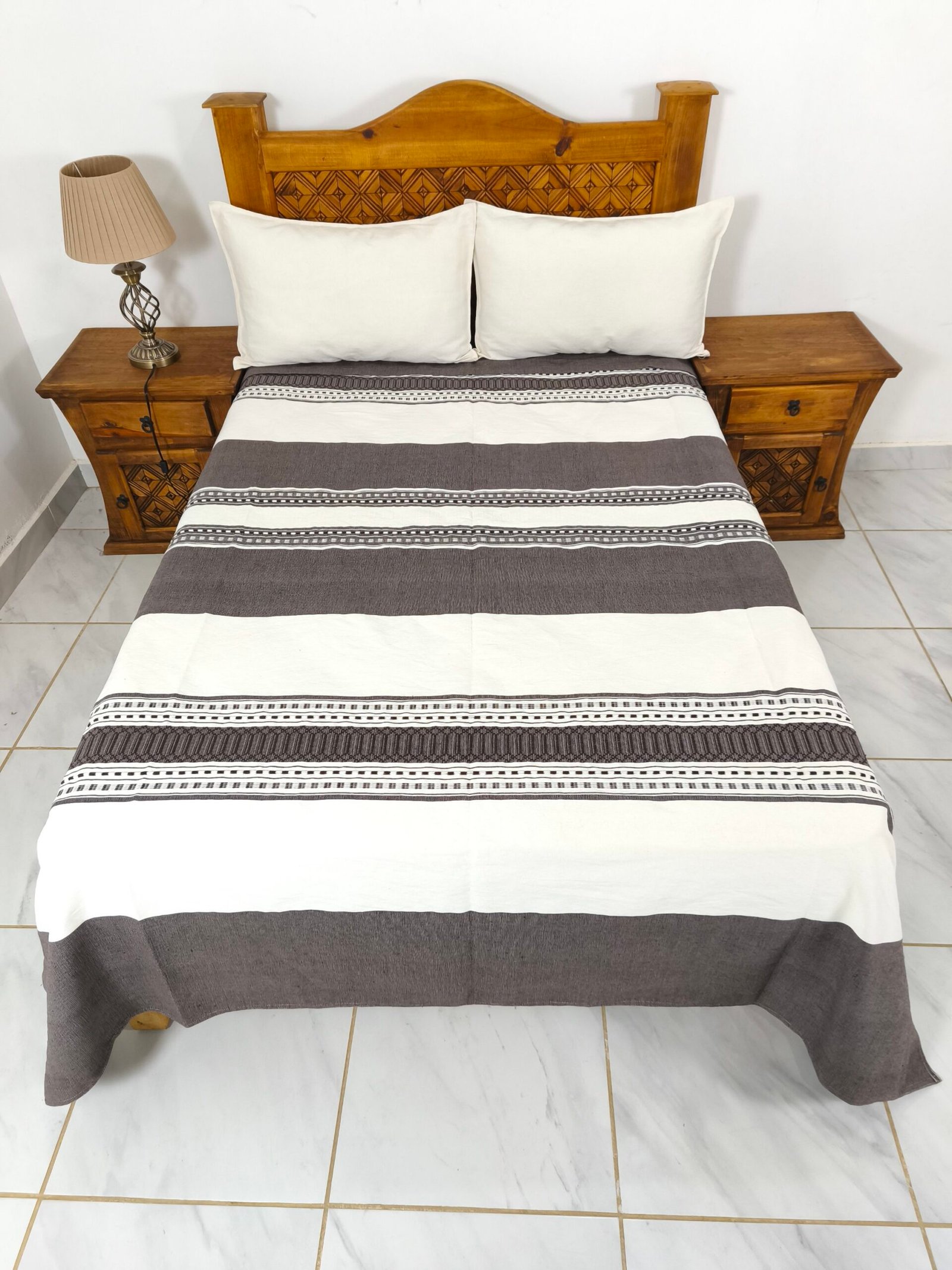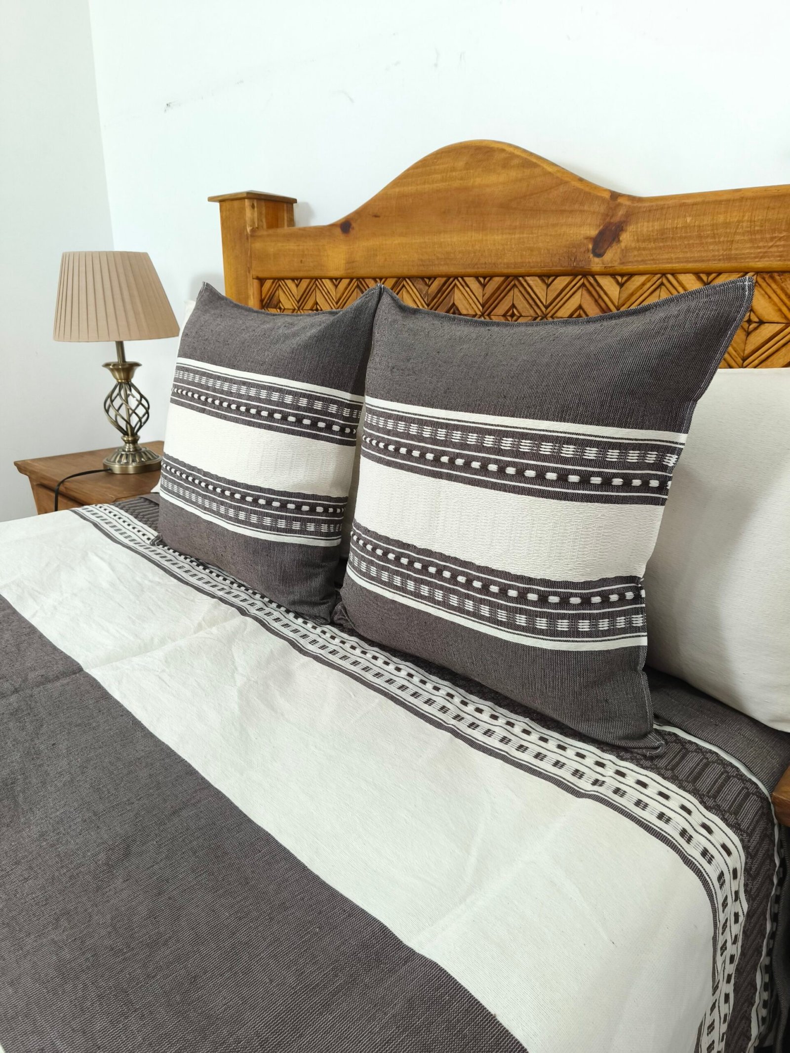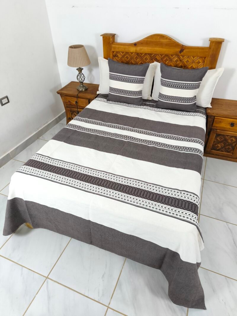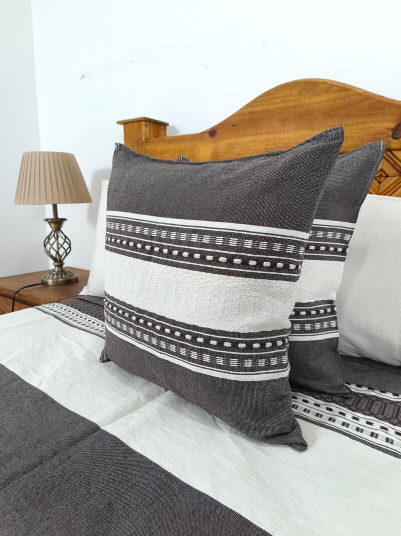 Juego de Colcha Artesanal con Cojines y Fundas – Algodón Chocolate con Natural.