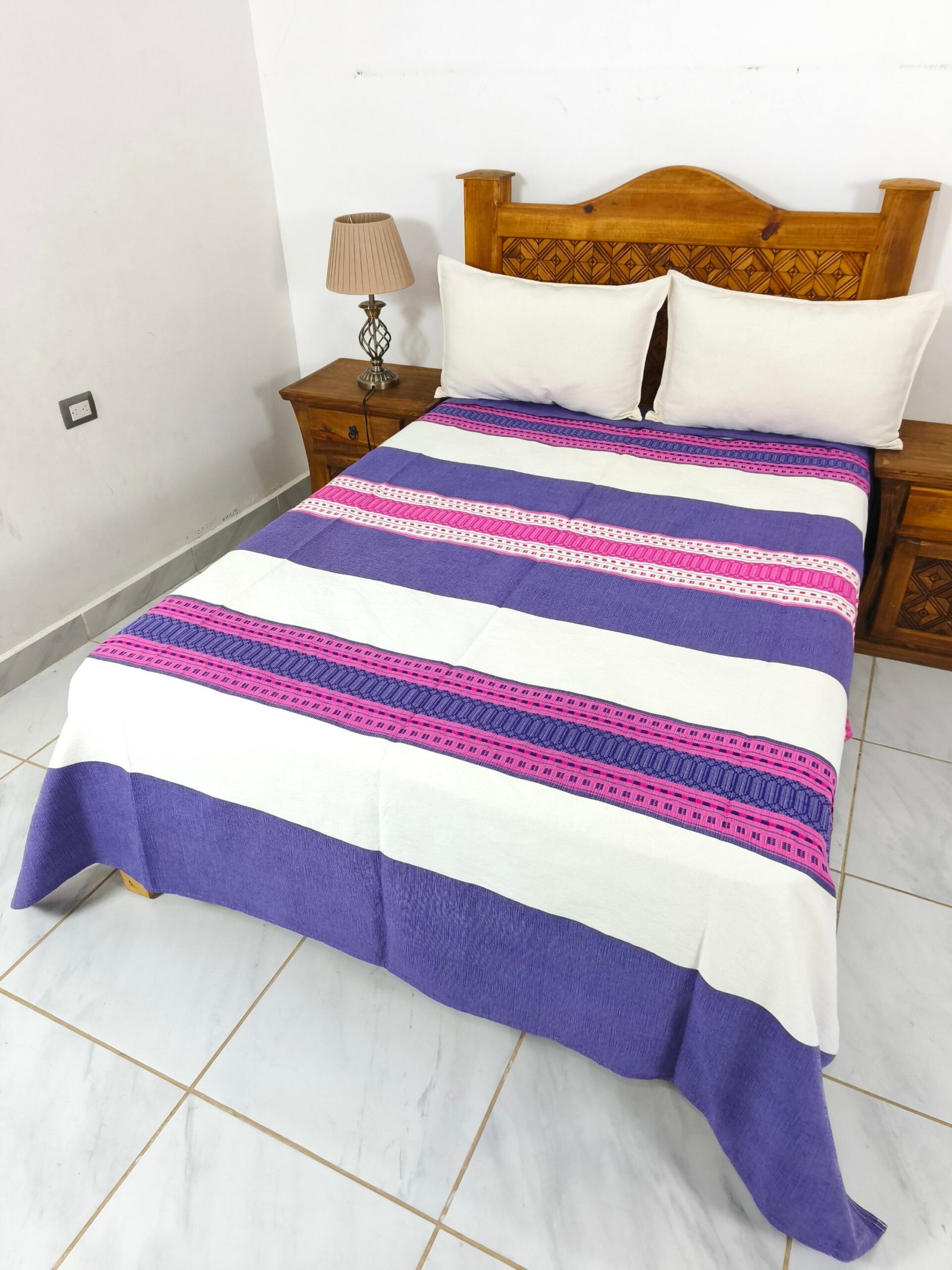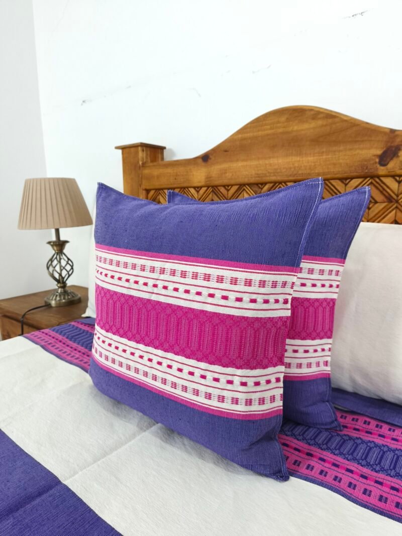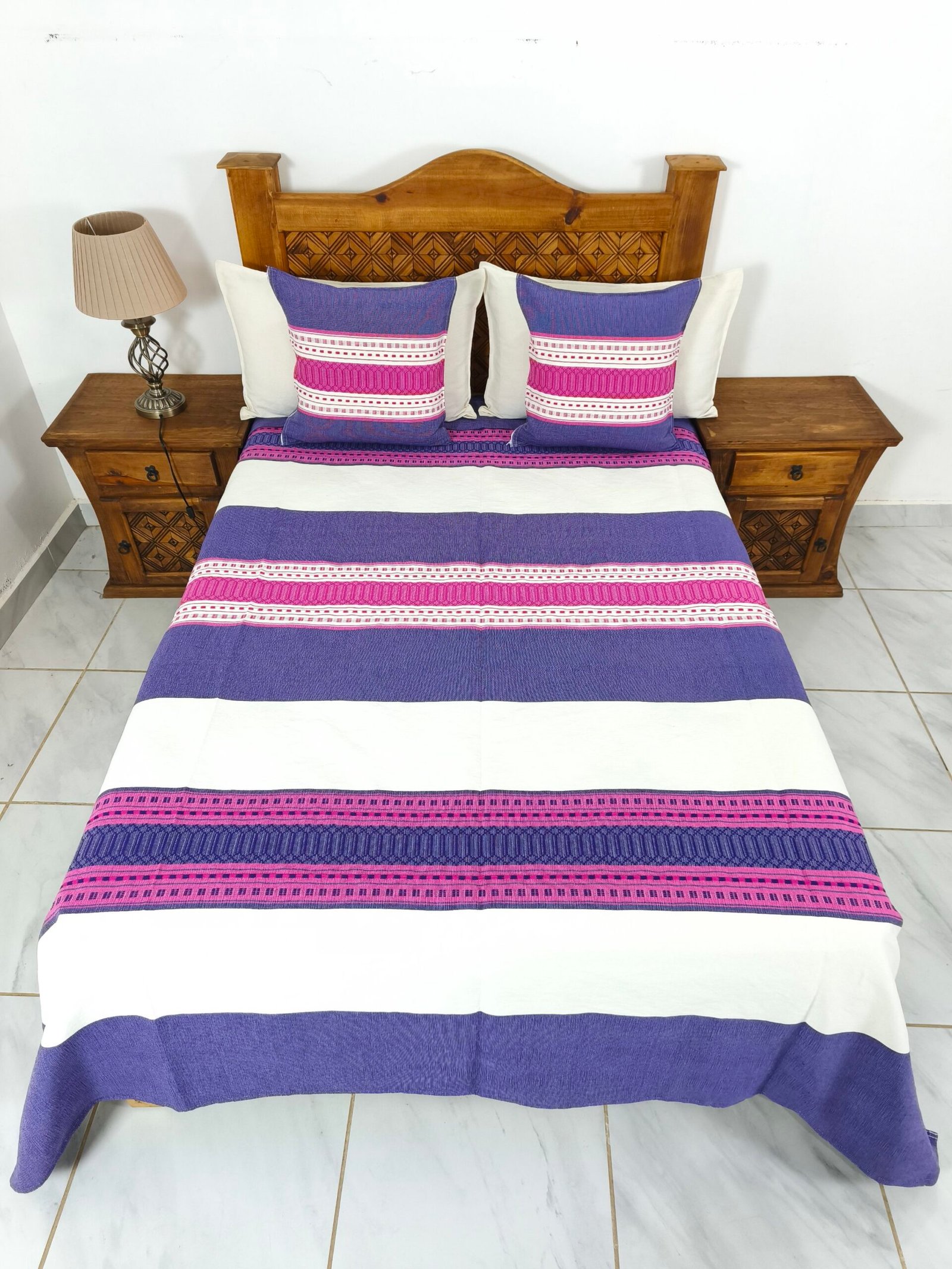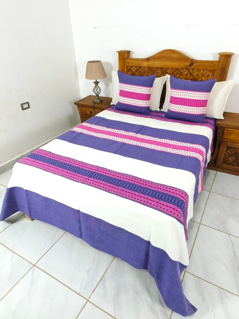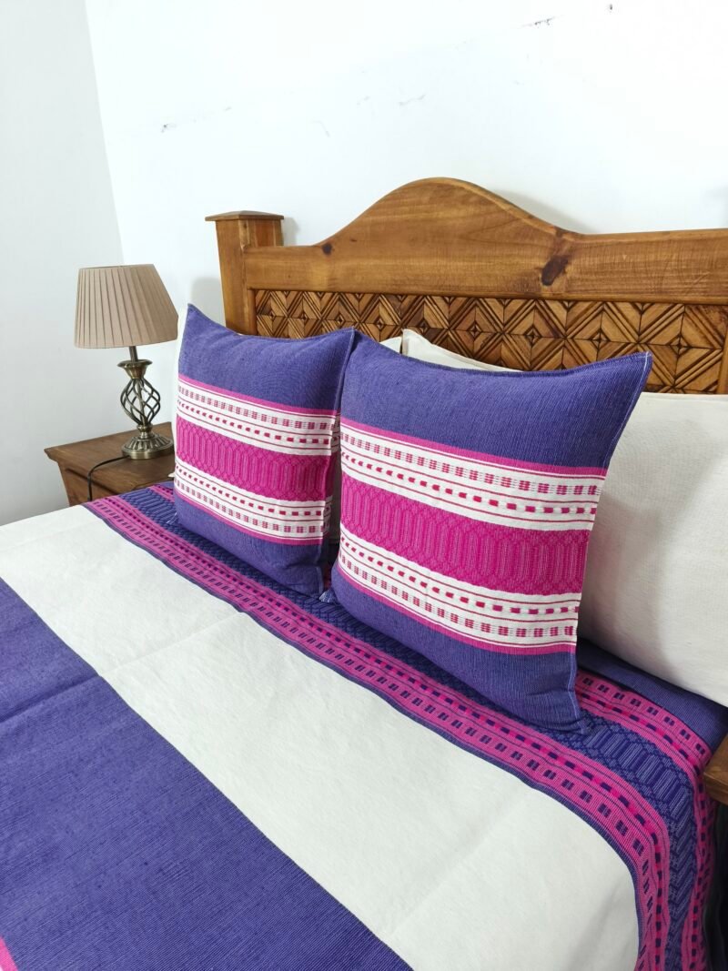 Juego de Colcha Artesanal con Cojines y Fundas – Algodón Morado Natural Detalles en Rosa