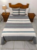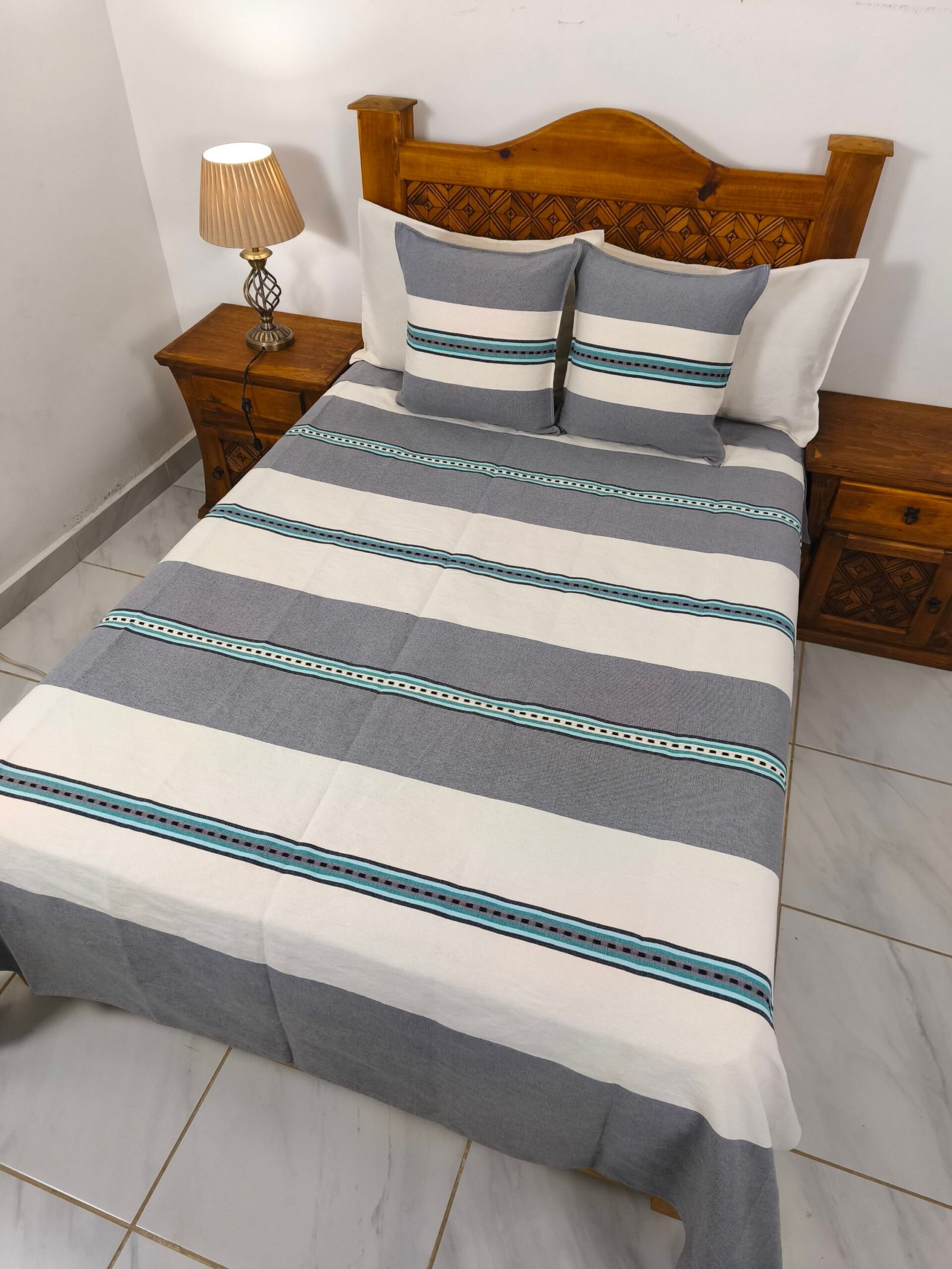 Juego de Colcha Artesanal con Cojines y Fundas – Algodón Gris Oxford con Natural Cabecerita de colores.