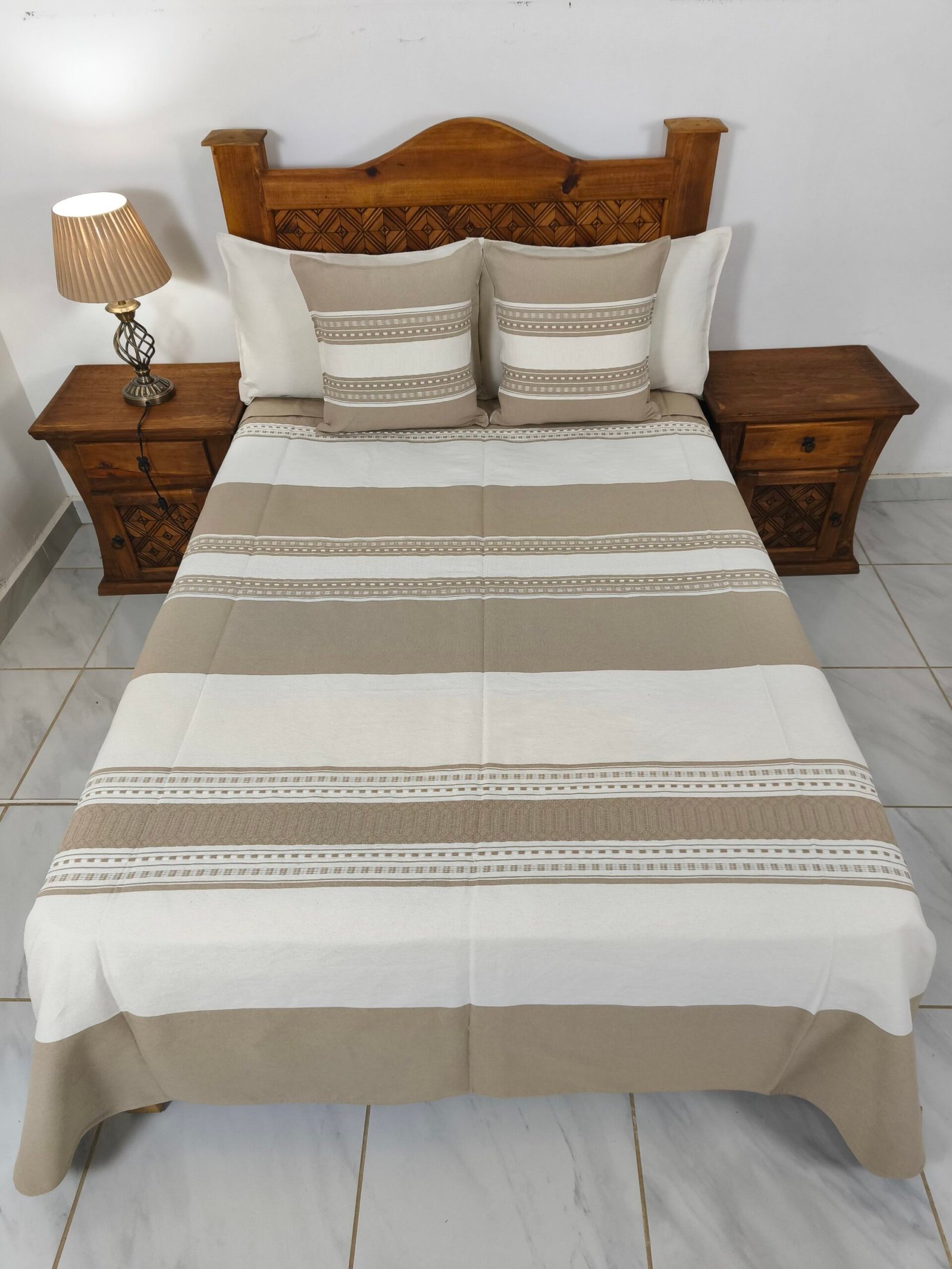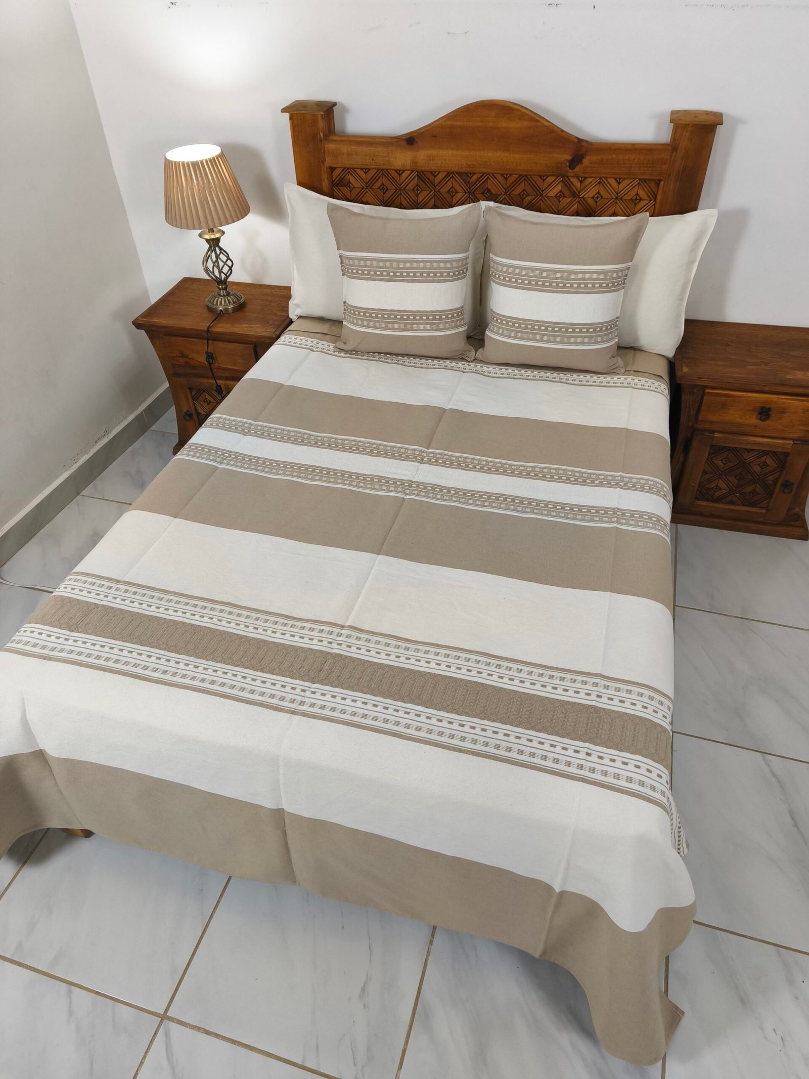 Juego de Colcha Artesanal con Cojines y Fundas – Algodón Café Bajo con Natural