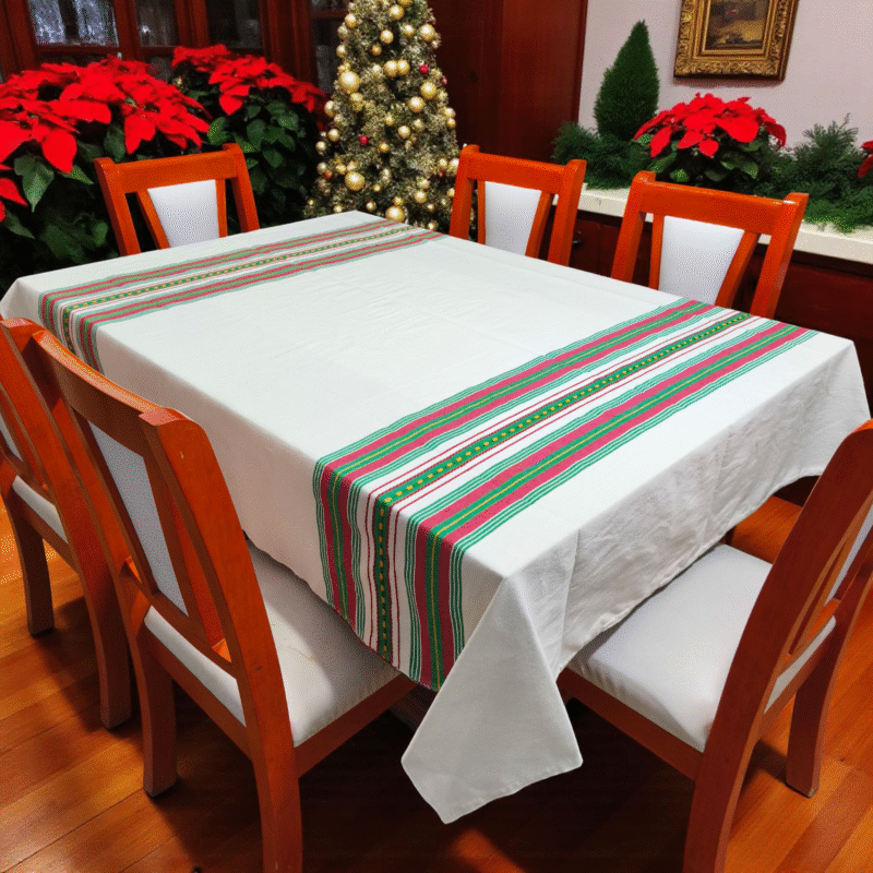 Mantel Artesanal Oaxaqueño Todo Natural detalles Verde Bandera, Rojo De Rayitas 4/6/8/10 Sillas – Hecho en Oaxaca